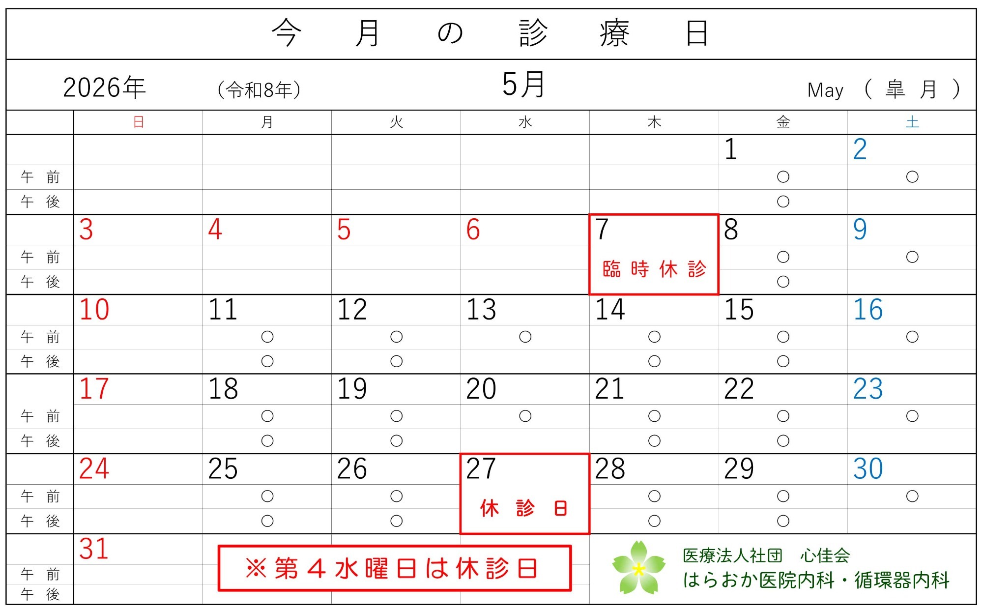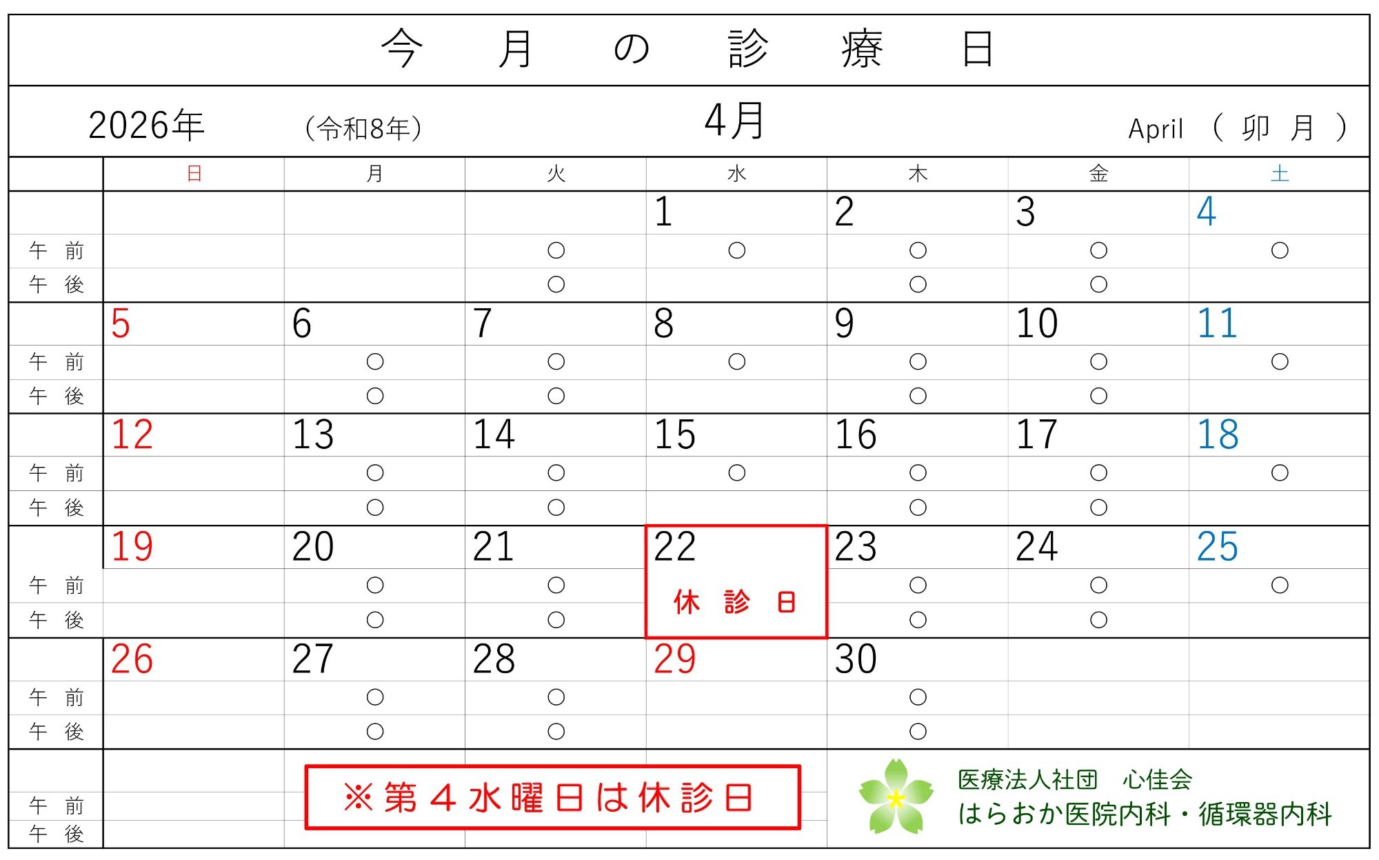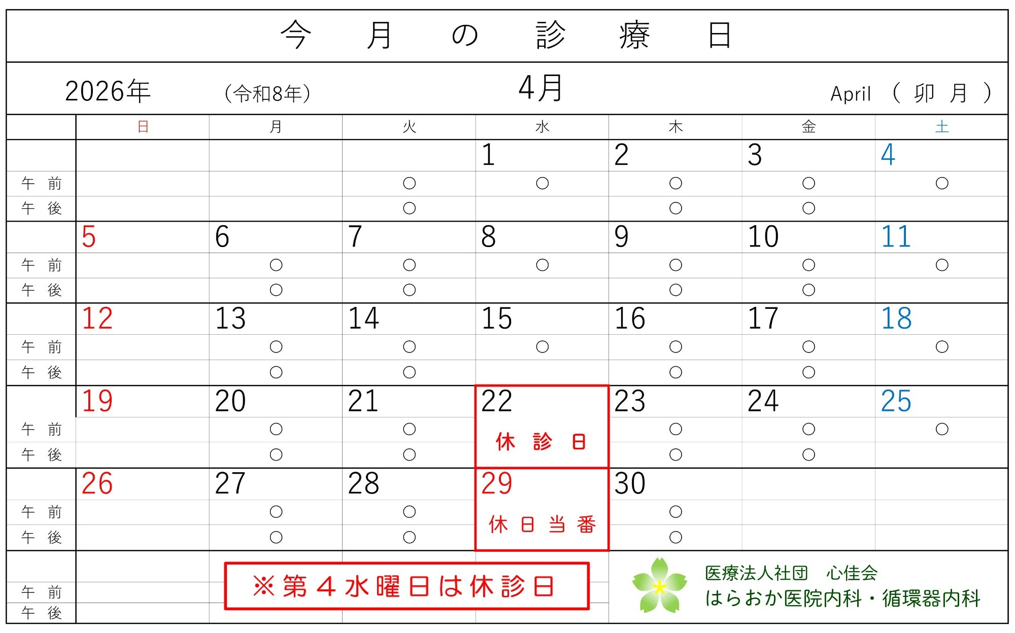 「毎月第4水曜日は休診日」